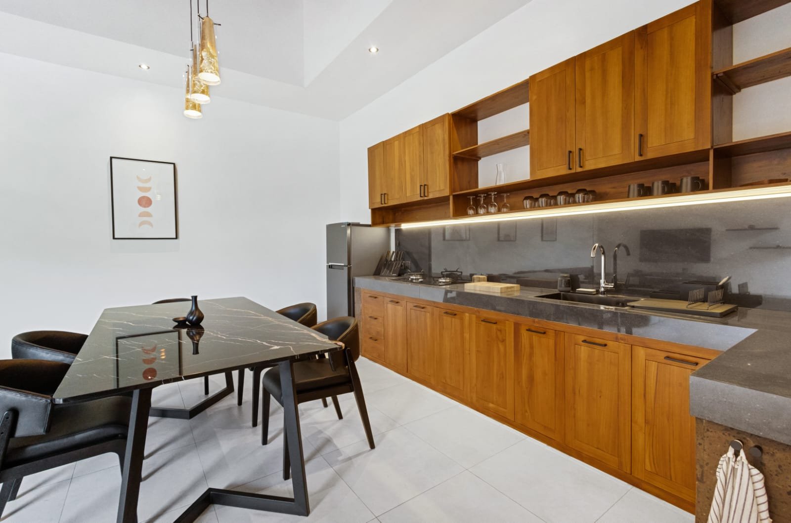 Villa Avante comes with an architectural and design concept that embraces Balinese elements and local materials with a modern twist. There are 2 bedrooms with ensuite bathroom and dedicated workspace facing the pool - in addition a big living and dining space that can be fully opened towards the lush garden at the pool.