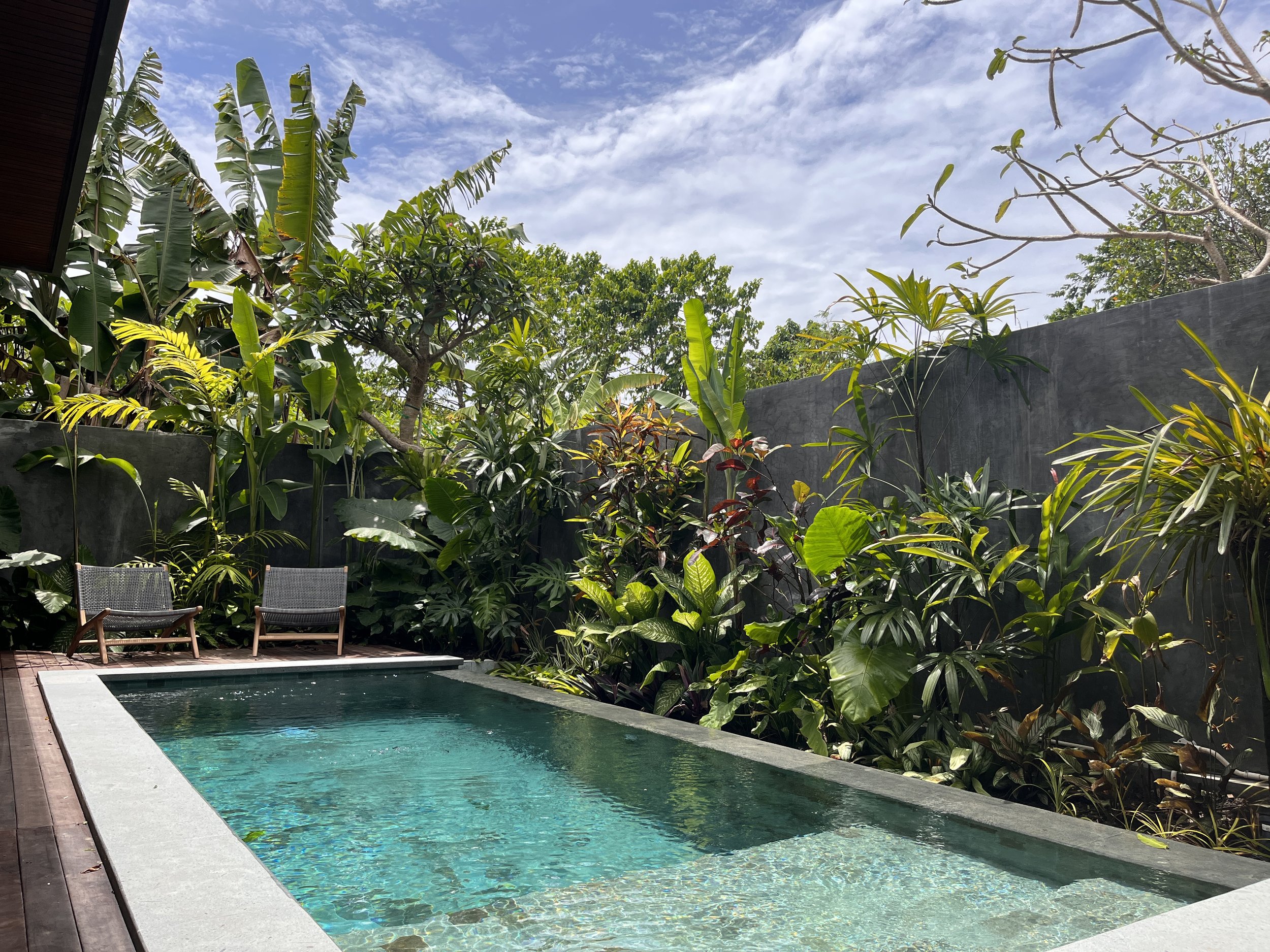 Enjoy the pool and outdoor area with lush greenery on the two sunbeds while the sun is setting or take a refreshing swim in the pool.
